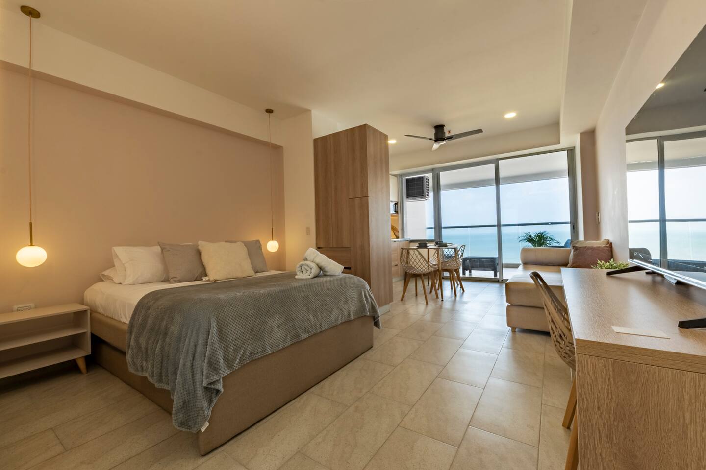 ✔ 14th-floor loft with private balcony & panoramic ocean views 🌊🏙️ ✔ Fully furnished with modern decor & elegant finishes ✔ Ideal for solo travelers, couples, or remote workers 💻