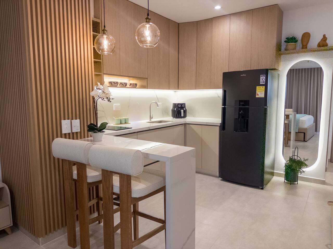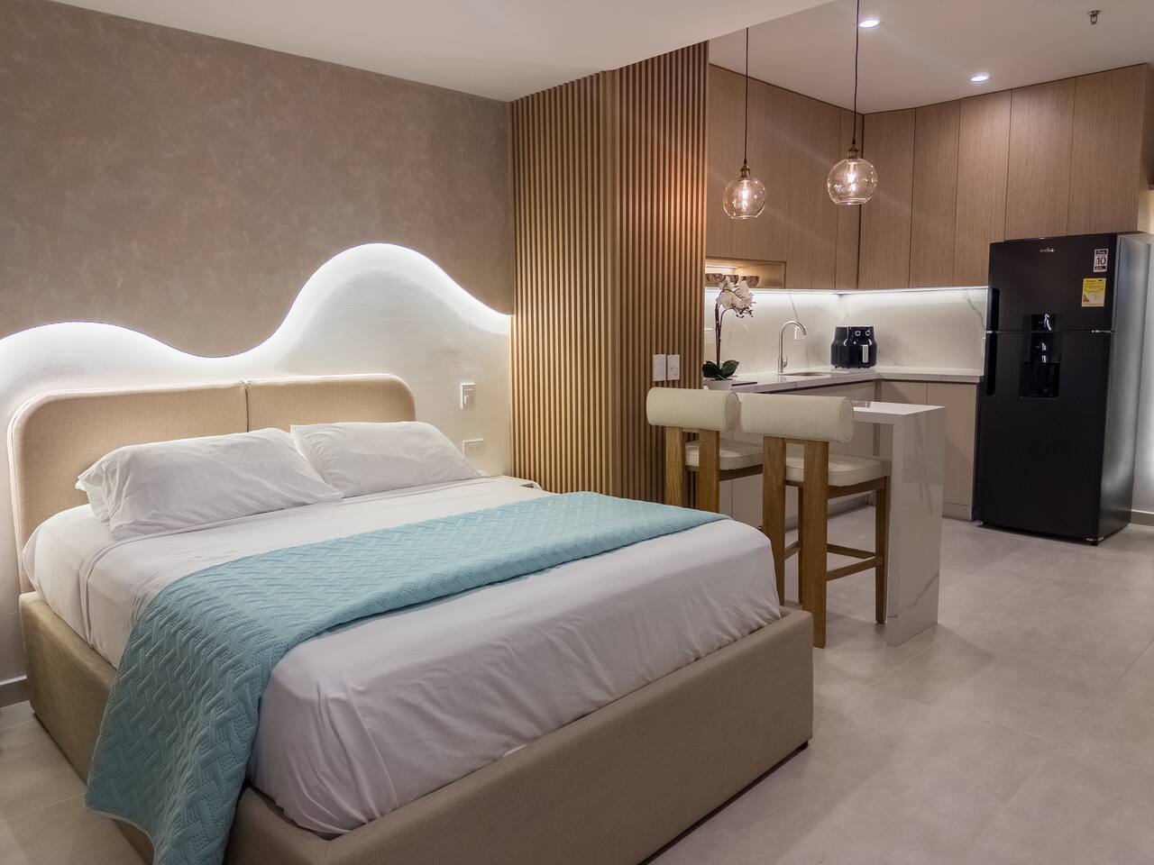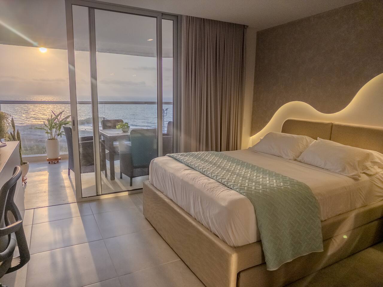 Despierta con el sonido del mar y una vista abierta al mar desde este elegante loft. Su diseño cálido y moderno crea un ambiente acogedor, perfecto para descansar o disfrutar una copa al atardecer en el balcón.